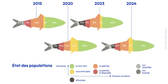 Le bilan 2025 de l’Ifremer montre qu’environ 50 % des volumes de poissons débarqués en France hexagonale en 2024 proviennent de populations exploitées durablement, c’est-à-dire non surpêchées, contre 44% estimés pour les débarquements de 2023 et seulement 18% en l’an 2000.